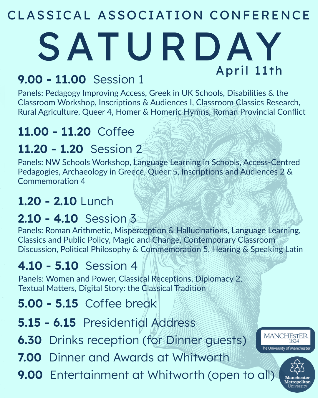 Manchester Metropolitan University and the University of Manchester will host the Classical Association Conference on 10-12 April 2026, with both in person and online attendance. Daily events will take place at the Business School of Manchester Metropolitan University, with the Gala Dinner, Prizegiving and Entertainment at the historic Whitworth Hall.