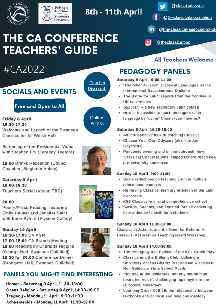On the opening evening, after a splendidly warm welcome from Professor Elwen Evans QC, Pro-Vice-Chncellorand Executive Dean for the faculty of Humanities and Social Sciences, we were treated to the premiere of a unique CA Presidential Address – a film, produced by Morphology Media, featuring 2021-22 President Stephen Fry in conversation with former CA Prize winner Professor Michael Scott. #FryandScott discussed Stephen’s long-held love for the ancient world, explored why Greek mythology is so timelessly engaging (as he captures in his trilogy Mythos, Heroes and Troy) and how ‘Classics is all around us’. Conference goers were delighted to see whom he would select if faced with ‘the Judgement of Stephen’ – just one of a range of entertaining questions posed by entrants to our Creative Writing Competition – and there was lots of audience participation in the quickfire round, with much deliberation over the best ancient fancy dress costume! You can watch some short clips as well as the full video on our YouTube Channel and Instagram.